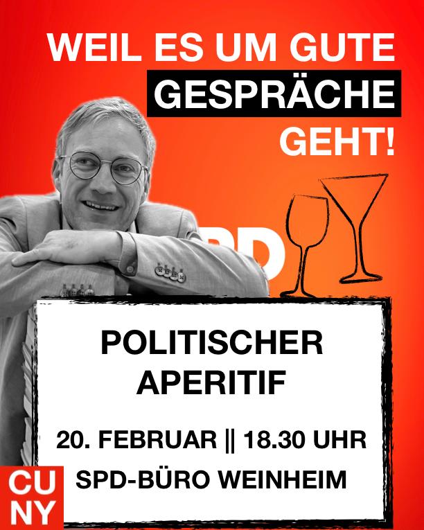 Aufgrund einer Terminüberschneidung mit dem Wahlforum, welches die Volkshochschule Badische Bergstraße mit allen Kandidierenden veranstaltet, wird der Aperitif ausnahmsweise bereits am dritten Freitag des Monats, also am 20. Februar 2026 um 18.30 Uhr im SPD- Büro in der Hauptstraße 128 gereicht. Eingeladen sind wie immer Menschen mit und ohne Parteibuch, die das offene Gespräch bei einem guten Glas schätzen.